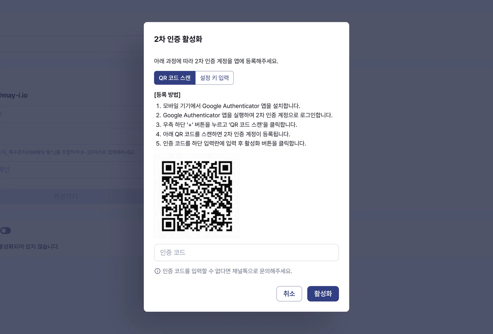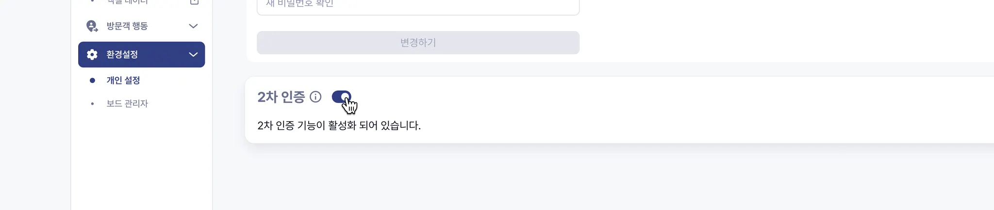 대시보드 좌측 메뉴 - 환경설정 - 개인 설정으로 들어간 뒤, 2차 인증 토글 버튼을 클릭합니다.