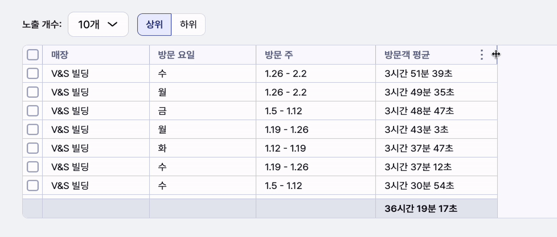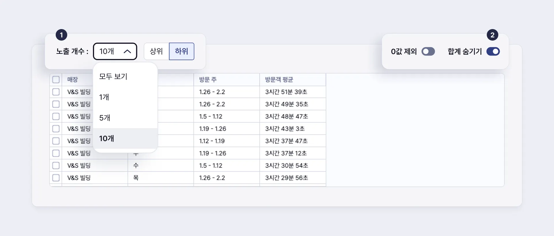 데이터 소스 테이블에서 노출 개수를 선택한 뒤 상위 혹은 하위 데이터를 선택할 수 있습니다.