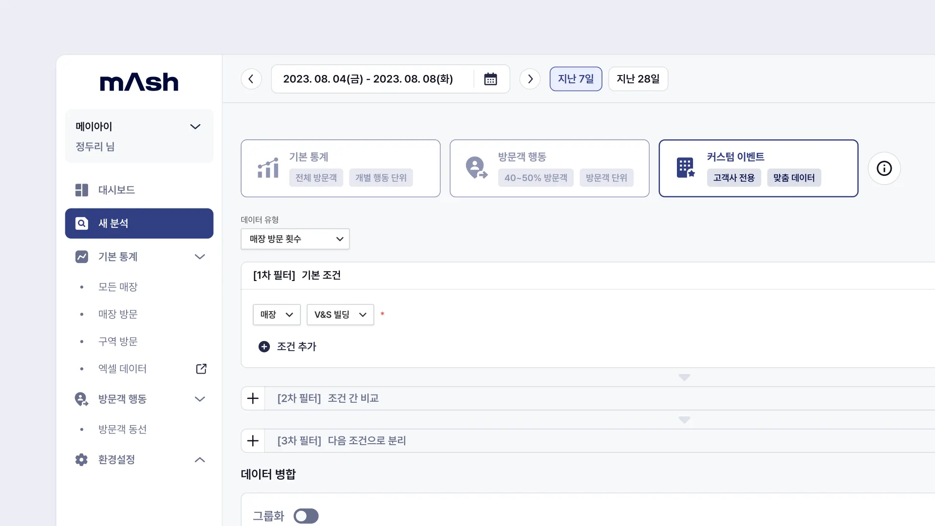 ‘커스텀 이벤트’ 데이터란 고객사 전용 맞춤 데이터입니다. 매쉬보드에서 볼 수 없는 데이터를 요청 주시면, 니즈에 맞게 데이터 전문가들이 매쉬보드에서 해당 데이터를 볼 수 있도록 도와드립니다.