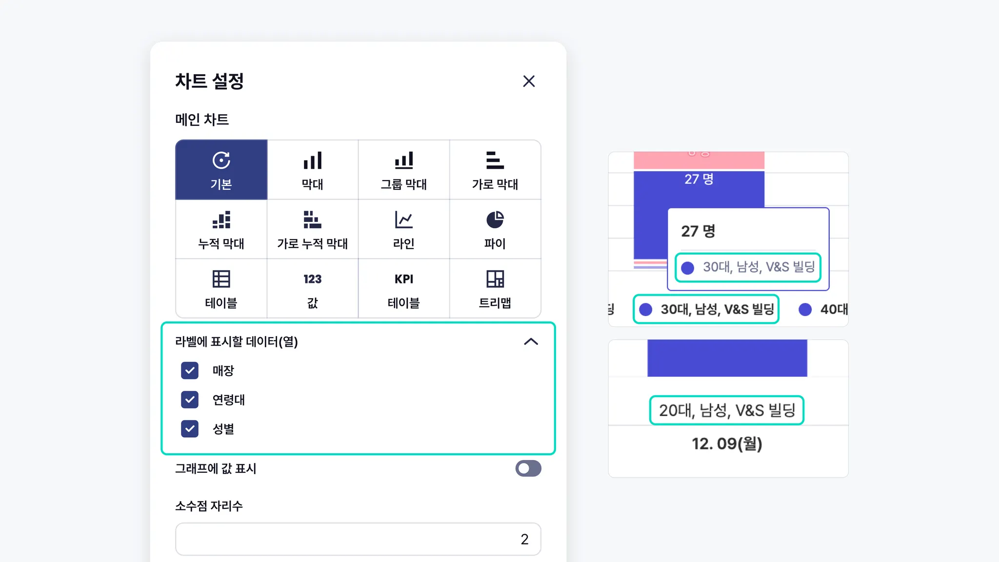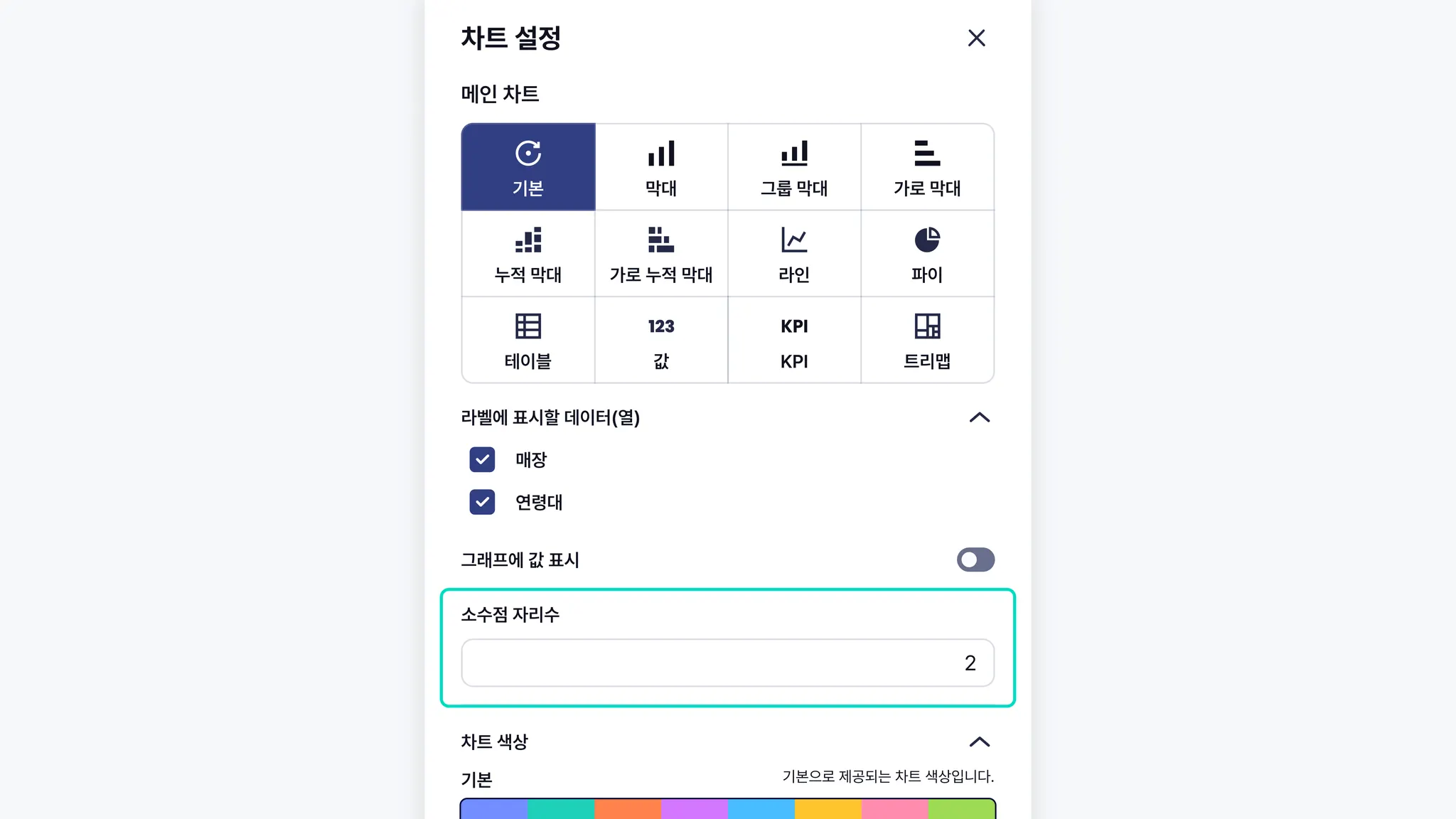 횟수, 비율 등 소숫점을 포함하는 데이터에서 차트에 표현되는 소숫점 자리수를 설정할 수 있습니다.