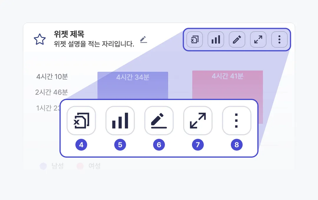 대시보드 내에서 데이터를 조회할 수 있는 블록을 말합니다. 위젯이 모여 하나의 대시보드를 구성하며, 니즈에 맞게 커스터마이징 할 수 있습니다.