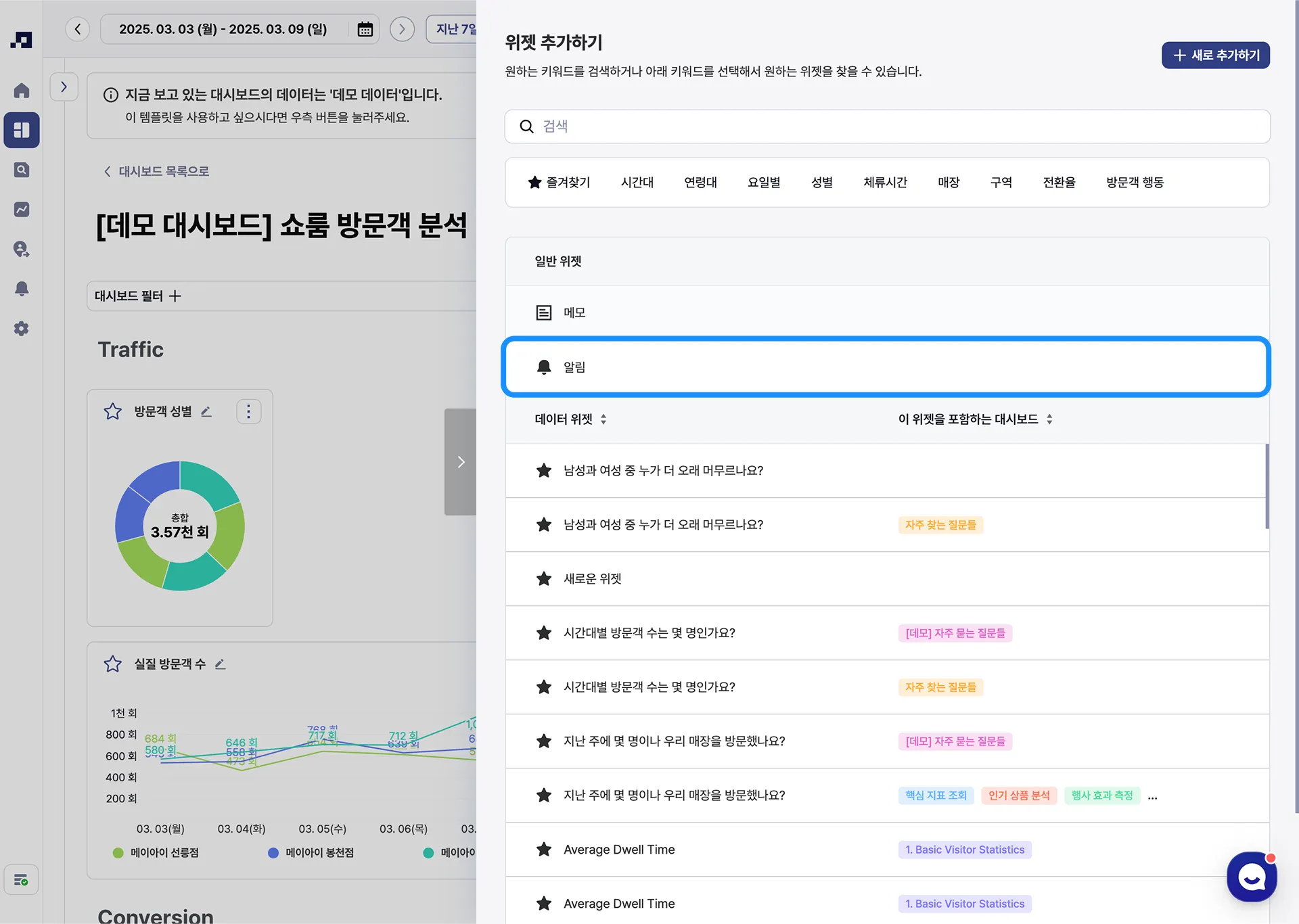 대시보드에서 위젯 추가하기 버튼을 눌러 ‘알림’ 위젯을 추가할 수 있습니다.