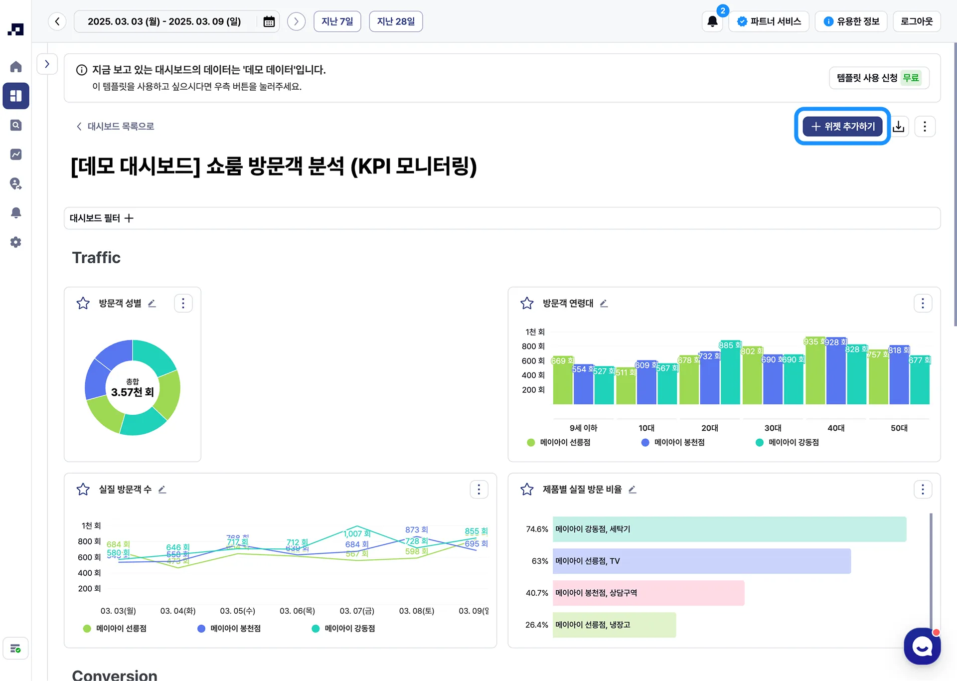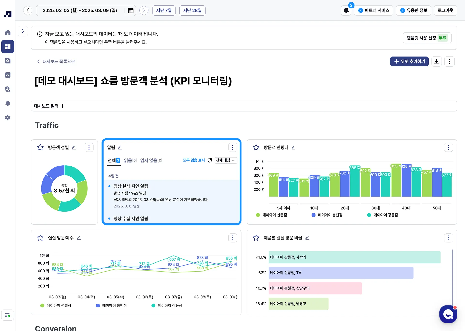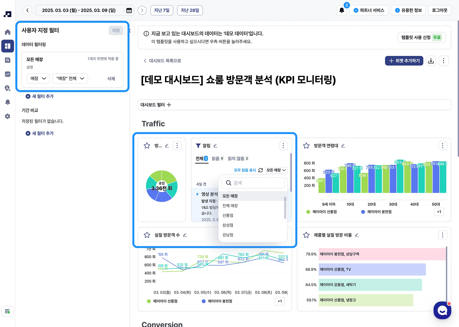 사용자 지정 필터가 적용된 대시보드라면, 알림 위젯에서도 이 (매장) 필터를 적용할 수 있습니다.