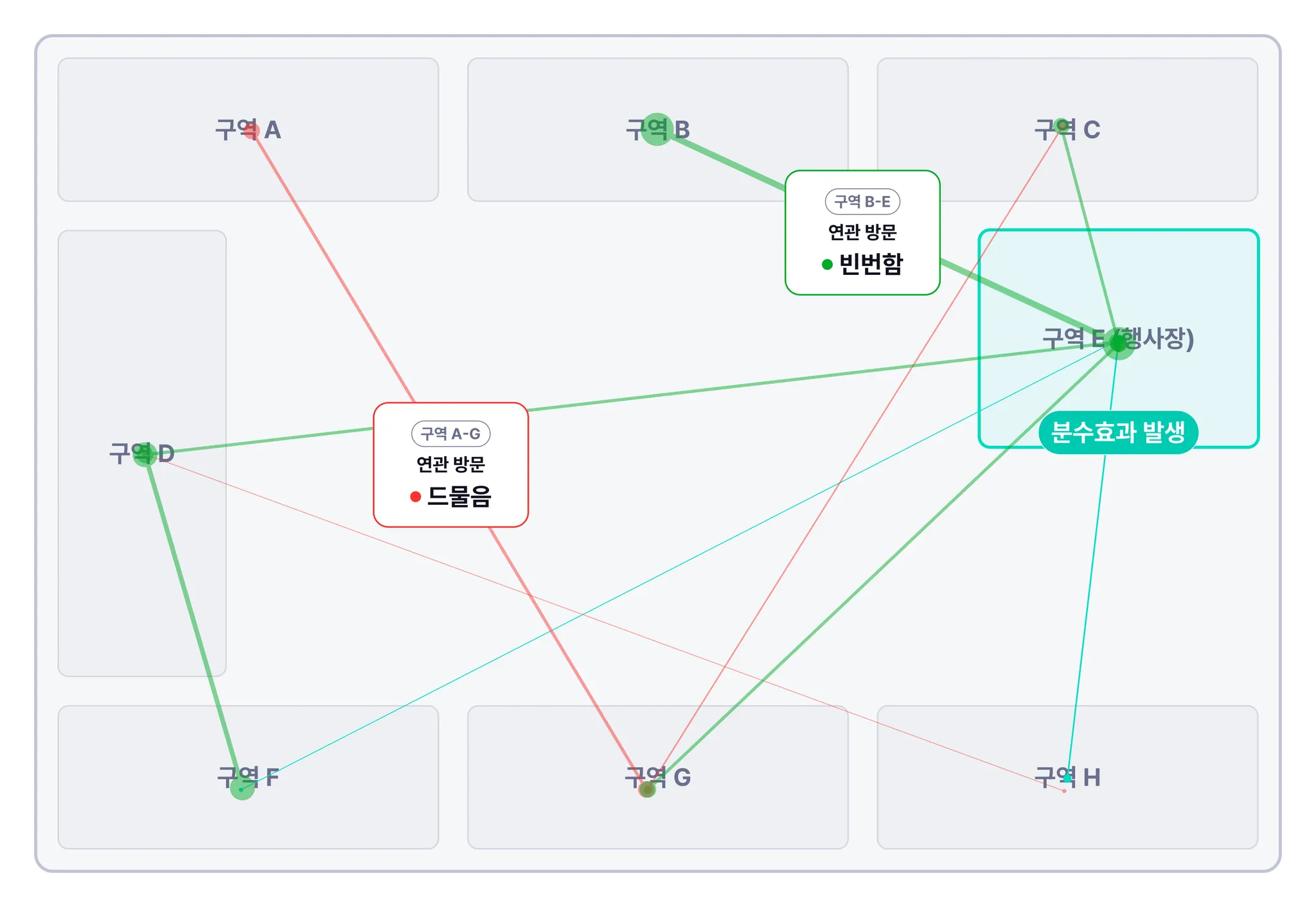 특히 연관 방문 지표를 통해 특정 구역에서 발생하는 ‘분수 효과’를 파악할 수 있습니다.