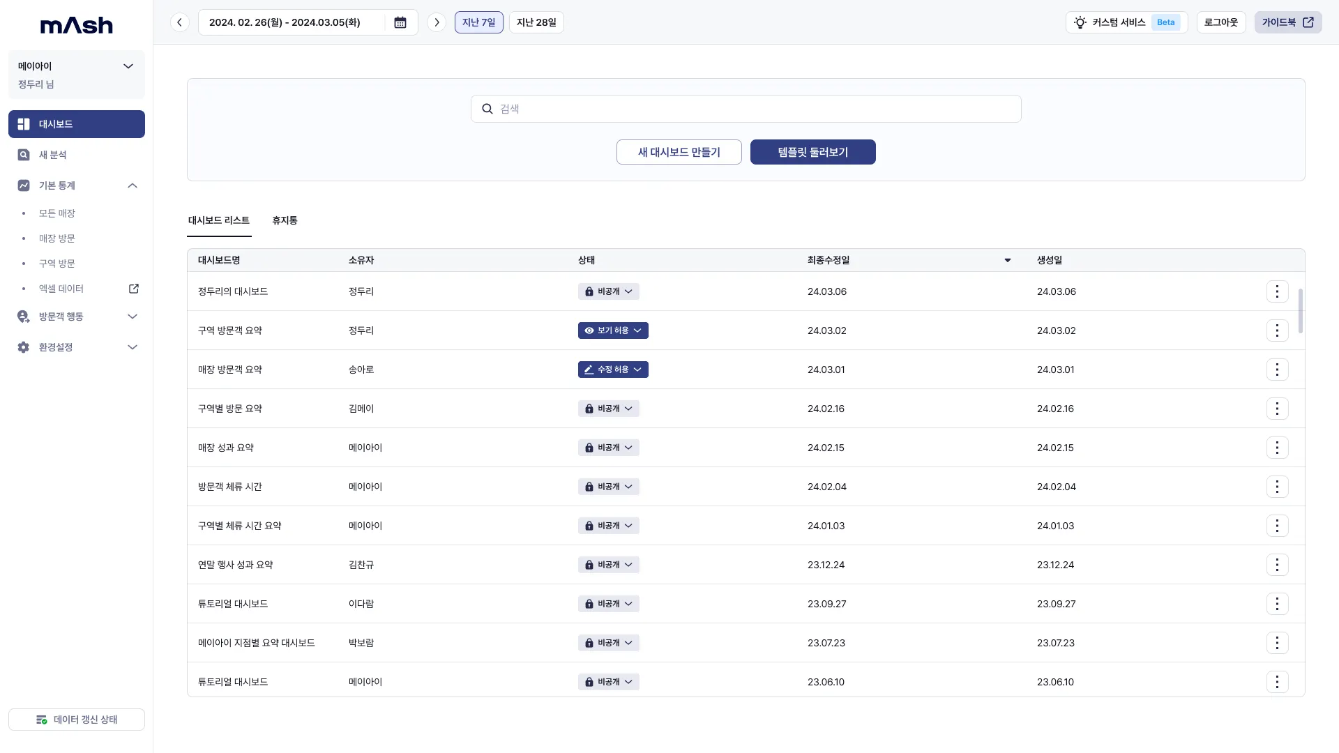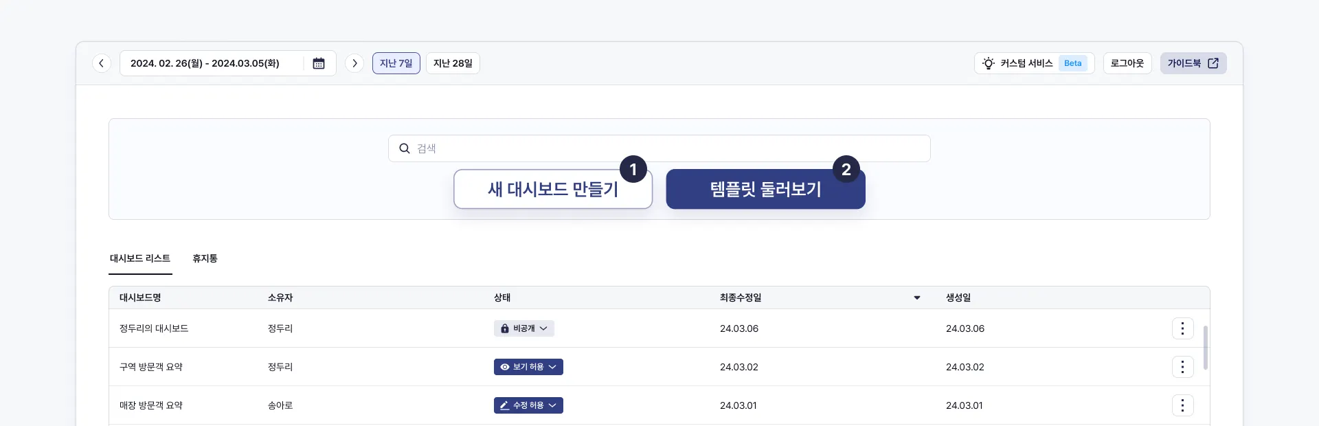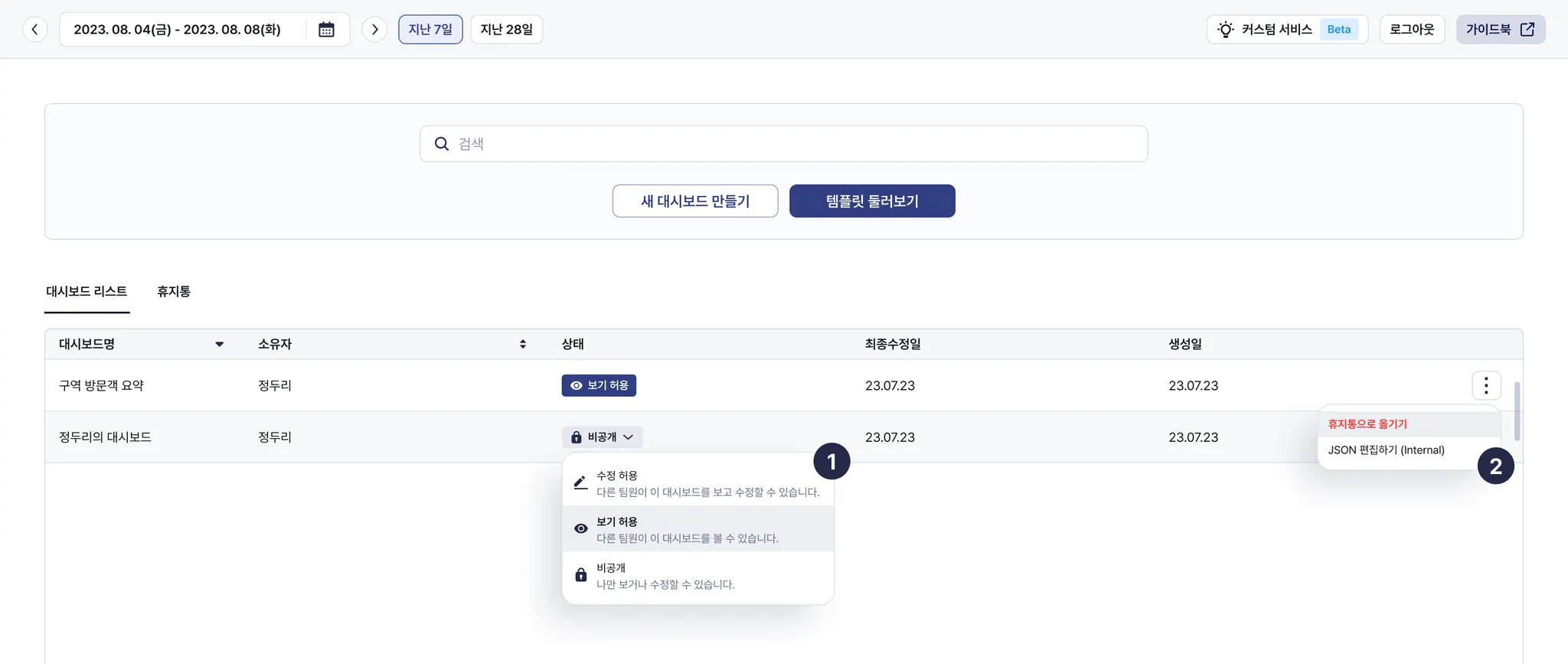 대시보드 리스트의 ‘상태’ 항목을 변경하여 대시보드의 권한을 수정할 수 있습니다.