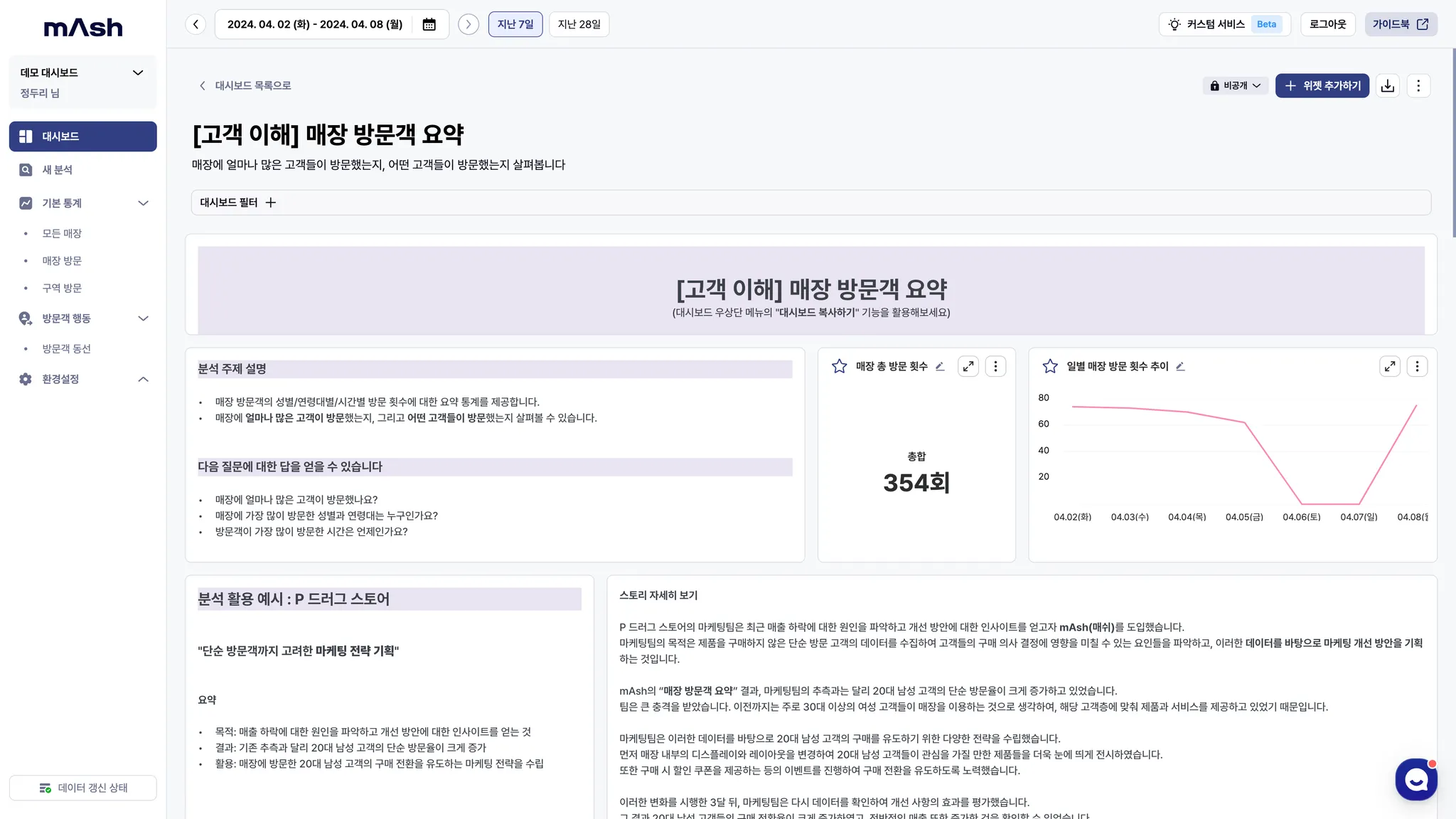 분석 니즈에 맞게 대시보드를 커스터마이징하여 데이터를 파악할 수 있습니다.