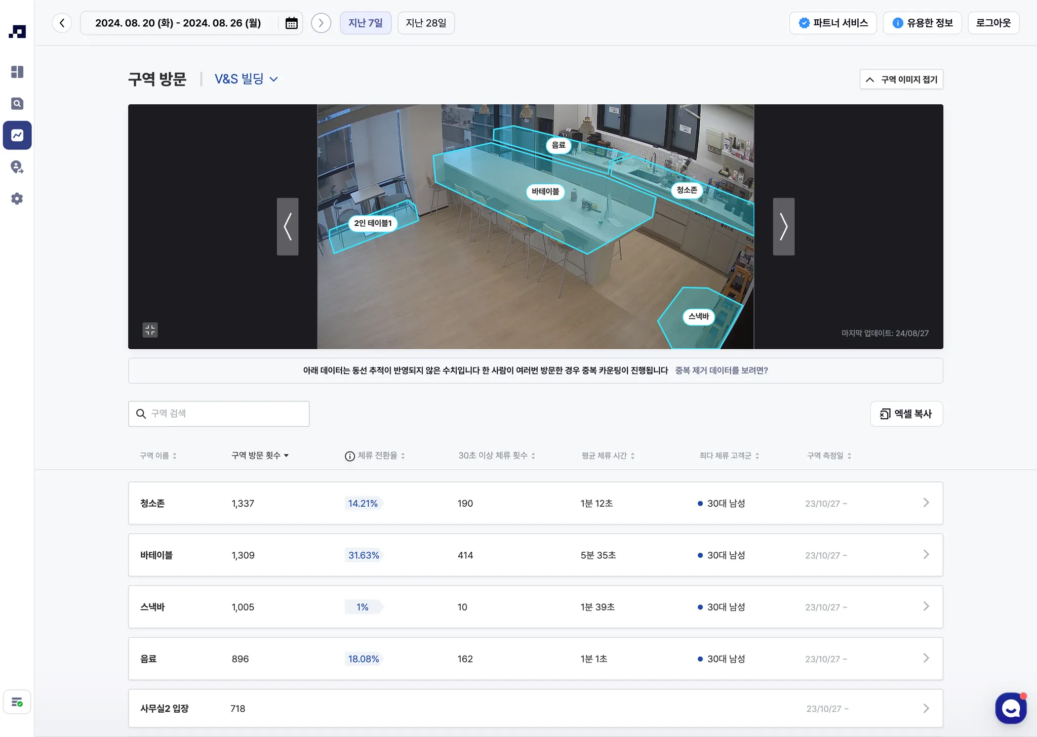 구역 방문 및 체류 등 매장 내 상품 구역들에 대한 핵심 KPI를 확인할 수 있습니다.