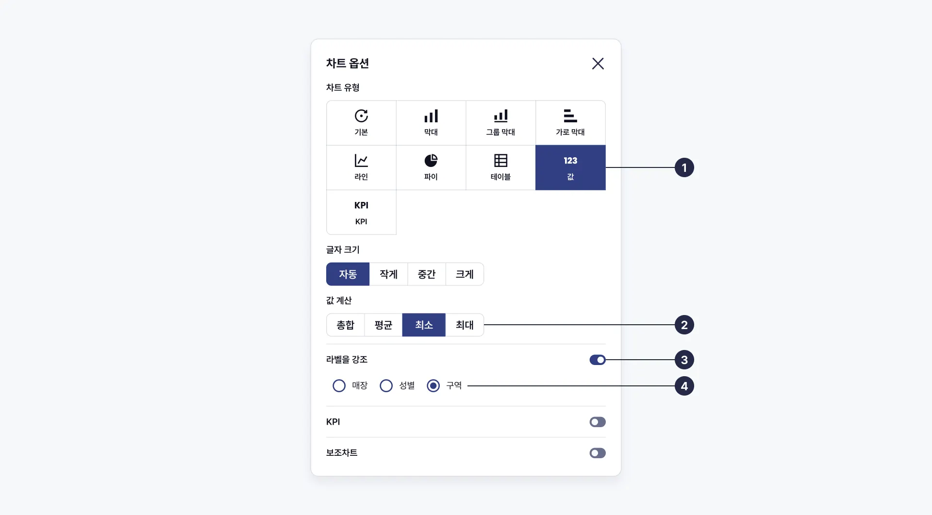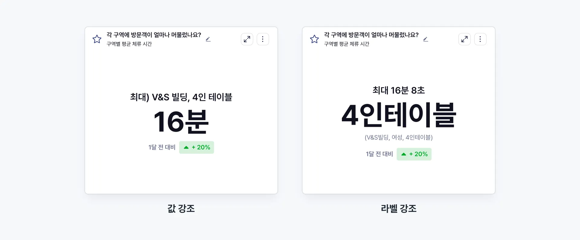 방문객 수보다 가장 많은 고객이 방문한 구역이 더 중요하다면, 값보다 라벨을 더 큰 텍스트로 볼 수 있습니다.
