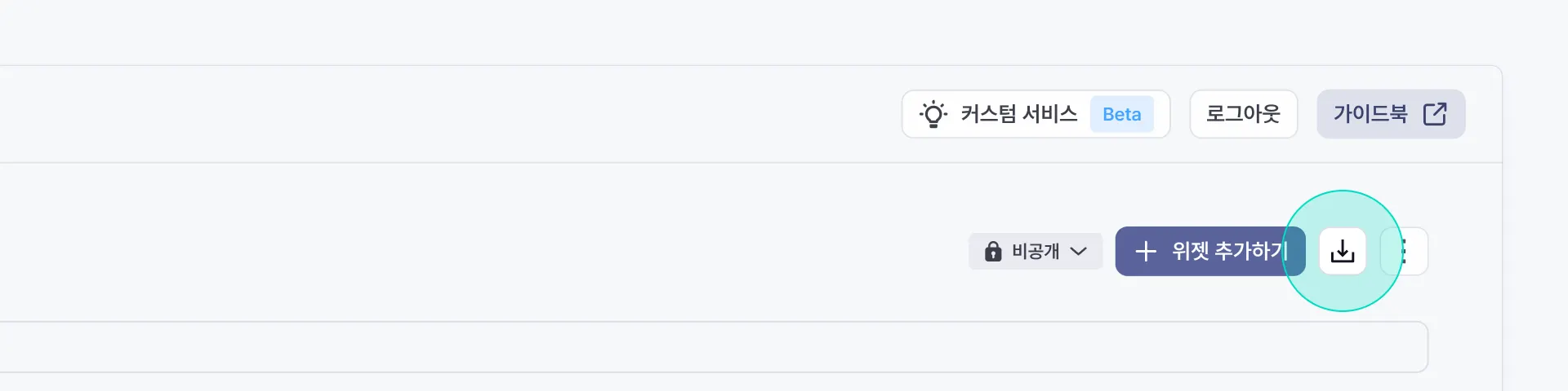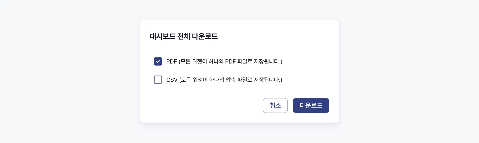 대시보드 내의 모든 위젯 데이터를 내려받고 싶은 경우, 원하는 형식으로 한 번에 내려받을 수 있습니다.