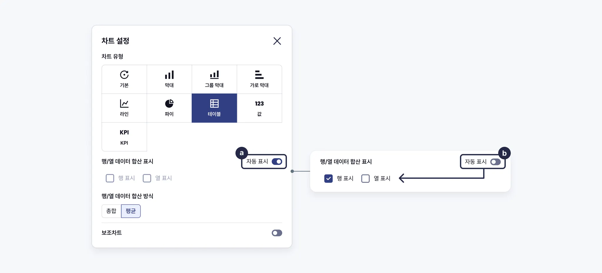 b. 자동 표시 토글을 끄면 데이터 합산 행/열의 표시 여부를 각각 선택할 수 있습니다.