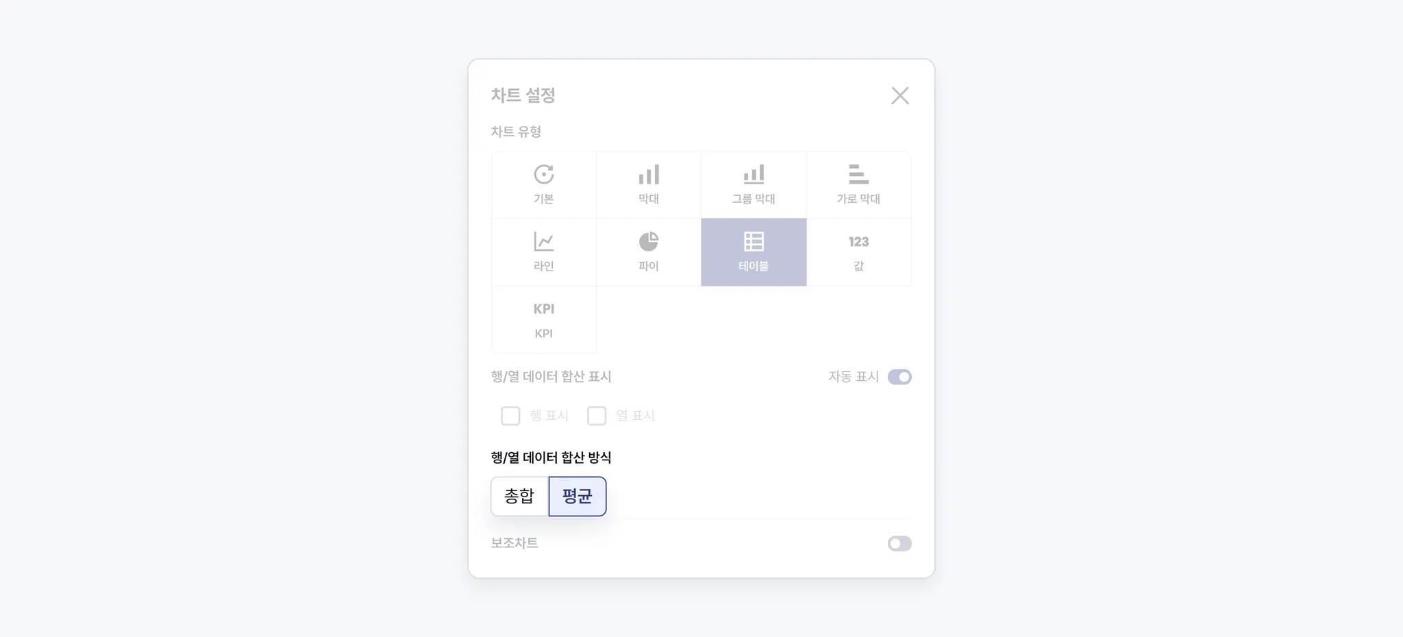 총합과 평균 중 데이터 합산 행/열에 어떤 계산식을 적용할 지 선택할 수 있습니다.