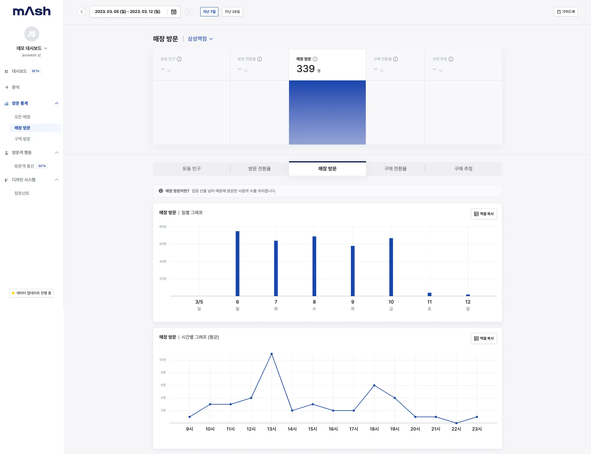 유동 인구, 매장 방문객, 구매 추정객 각각에 대하여 다음과 같은 데이터를 조회할 수 있습니다.
