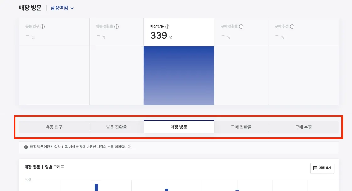 탭을 선택하여 유동 인구, 매장 방문객, 구매 추정객 각각에 대한 자세한 데이터를 확인할 수 있습니다.