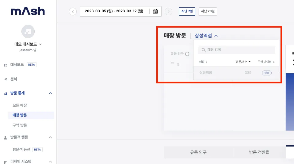 [매장 방문] 페이지에서 유동인구, 방문객 및 구매에 해당하는 매장별 핵심 KPI를 파악할 수 있습니다.