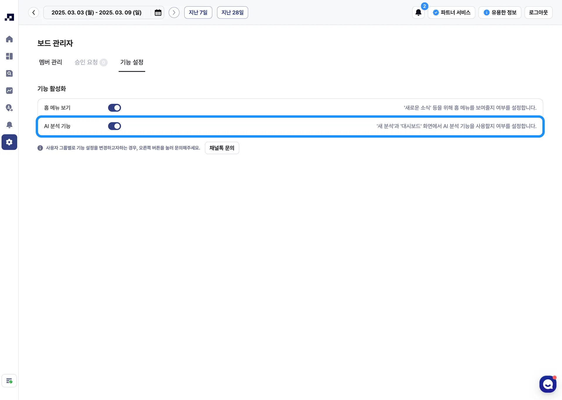 [메뉴의 설정 - 보드 관리자 - 기능 설정 탭]에서 AI 분석 기능 토글을 눌러 활성화해주세요.