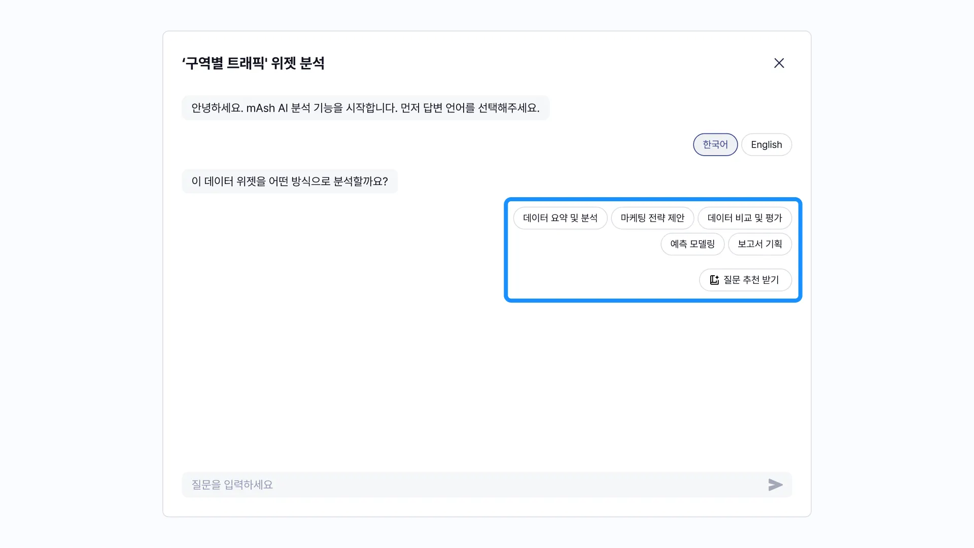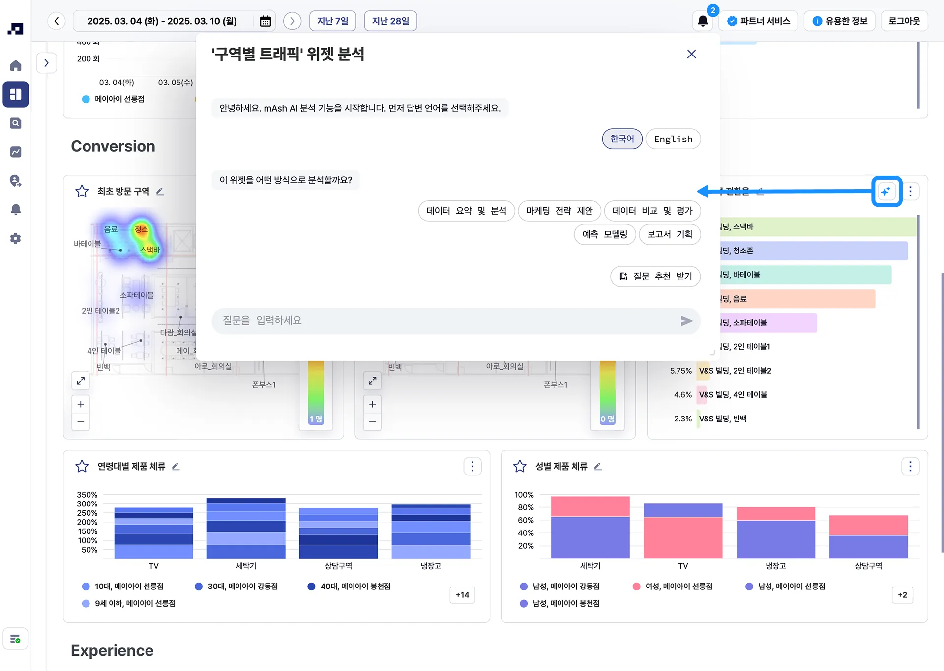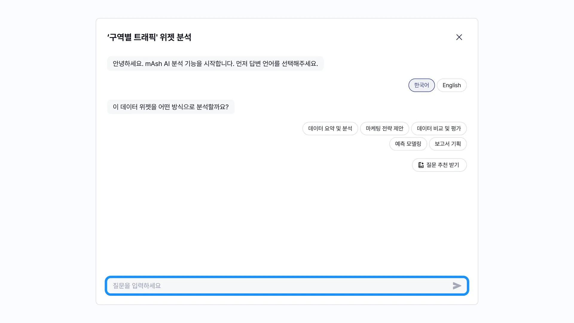 mAsh AI 분석 기능은 데이터를 더욱 쉽게 이해하고 전략적인 의사결정을 할 수 있도록 도와주는 서비스입니다. mAsh의 ‘대시보드’ 와 ‘새 분석’ 메뉴에서 사용 가능하며, 데이터 요약부터 보고서 작성까지 다양한 업무에 유용하게 활용할 수 있습니다.