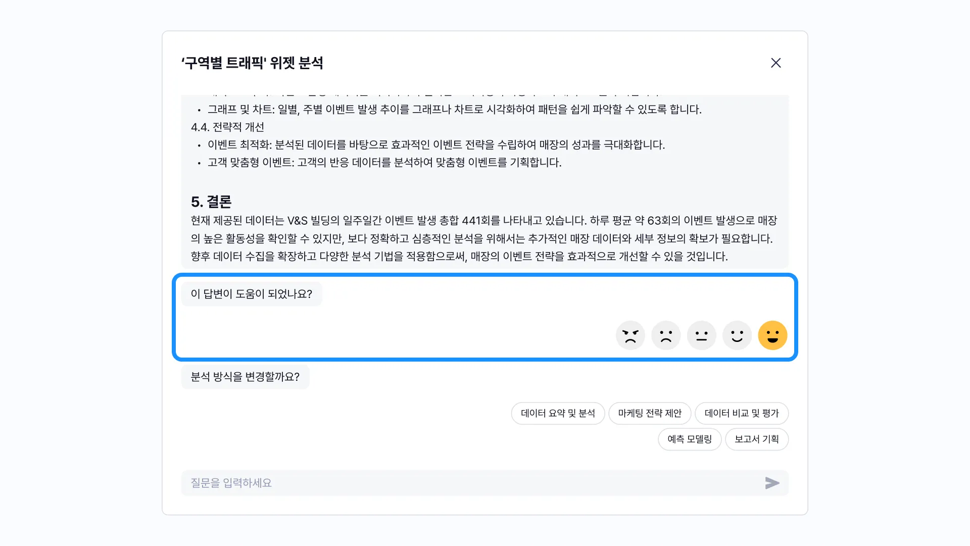 질문 입력 시, 구체적이고 명확한 표현을 사용할수록 더 정확한 결과를 얻을 수 있습니다.