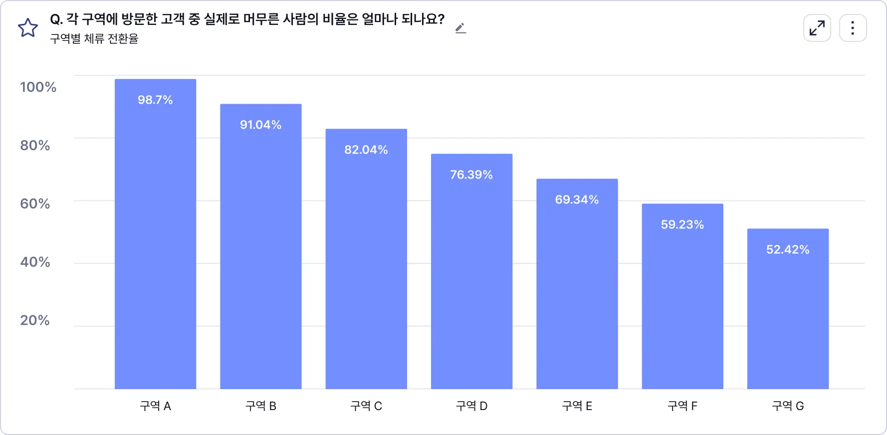 특정 구역의 구역 체류 전환율은 해당 구역을 방문한 방문객 중에 해당 구역에 체류한 방문객의 비율로 표현됩니다.