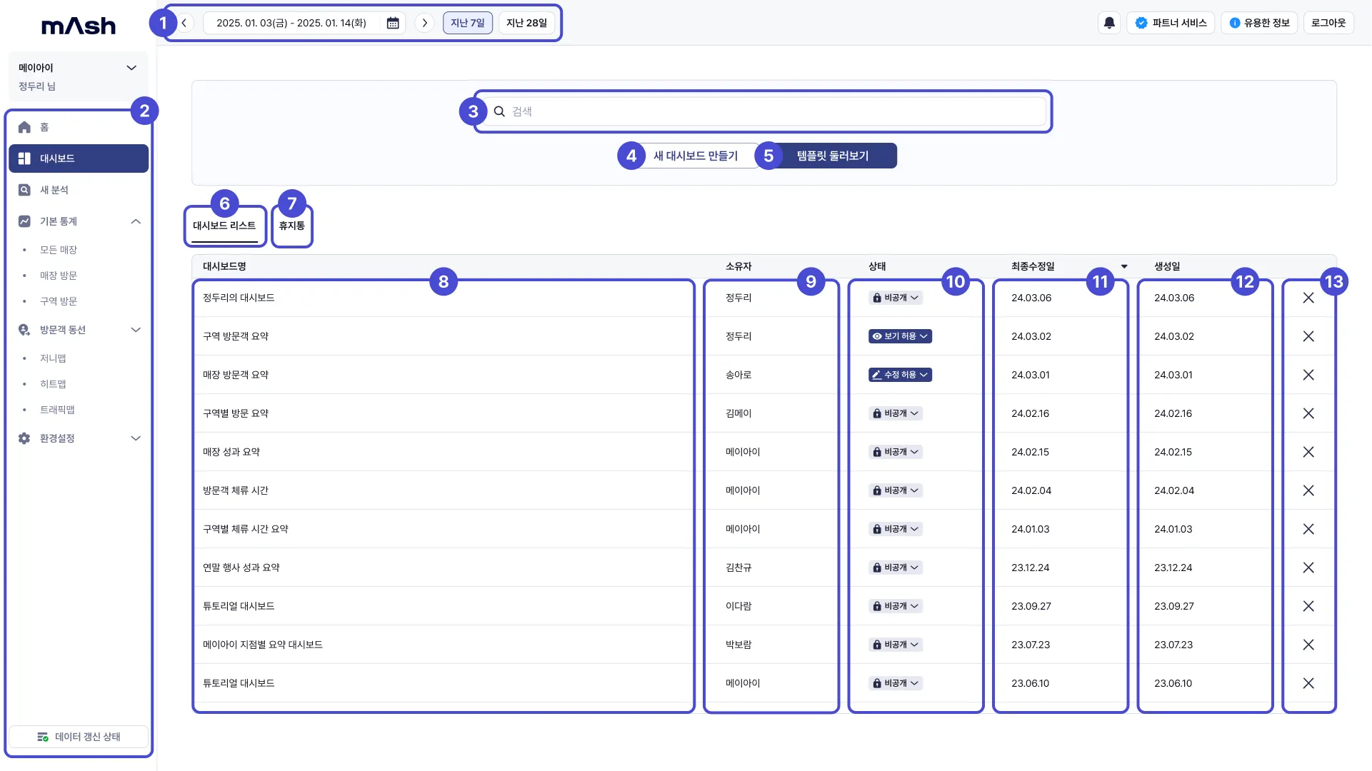 대시보드 화면은 다음과 같이 구성되어 있습니다.