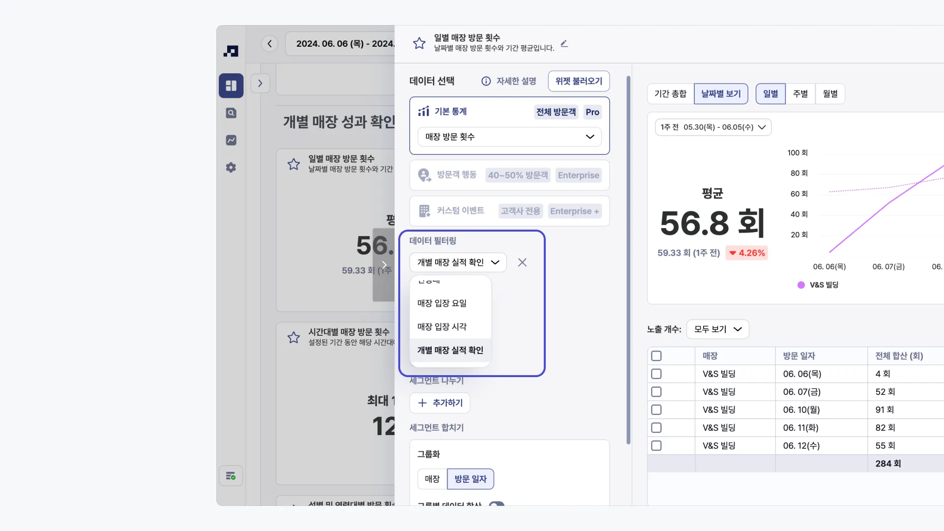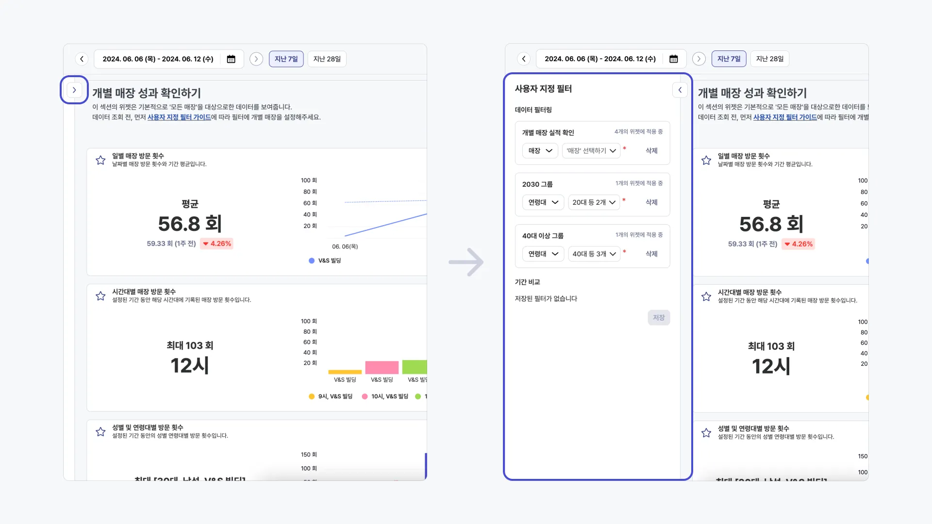 (e.g. 개별 매장 실적 확인 필터의 개별 매장 1개를 선택 후 적용하면, 대시보드에서 해당 사용자 지정 필터가 적용된 4개의 위젯에 모두 적용 됩니다.)