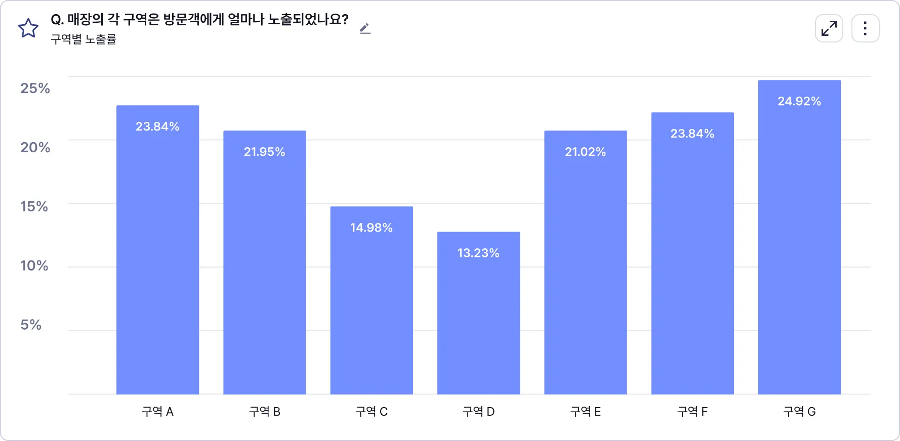 구역 노출은 매장의 다양한 구역들 중 어떤 구역이 방문객에게 더 많이 노출되었는지를 집계합니다. 그리고 이를 통해 얼마나 많은 방문객이 해당 구역을 지나가며 상품이나 광고를 볼 수 있었는지 측정할 수 있습니다.