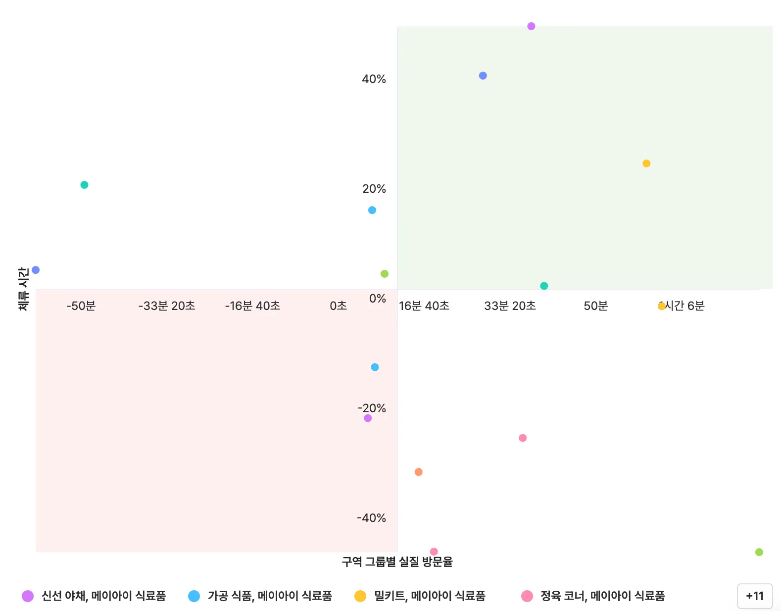 가로축은 방문율의 변화량, 세로축은 체류 시간의 변화량을 의미합니다.