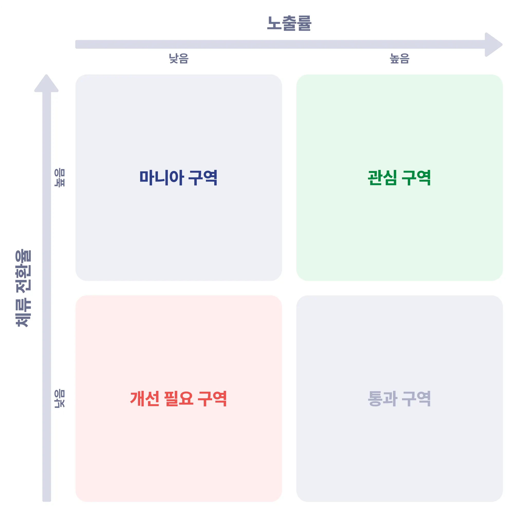 구역별 노출률, 체류 전환율, 체류 시간을 활용하면 크게 네 가지의 경우를 생각해 볼 수 있습니다.